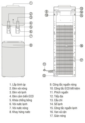 +) Bình chứa nước lạnh: Dung tích 3L, chất liệu Inox 304